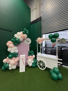 Featuring a custom pink gingham backdrop paired with a layered balloon garland in deep emerald, soft blush and crisp white, this design strikes the perfect balance between modern and whimsical. The custom round sign adds a personalised touch, while the luxe white candy cart and plinth create beautiful styling opportunities for cakes and desserts.